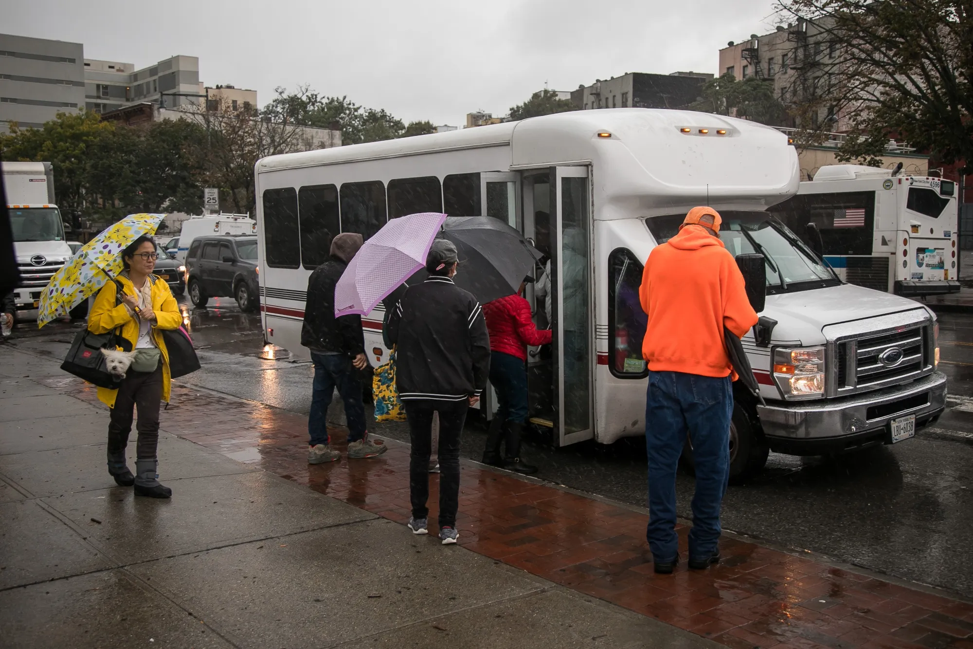2023年9月29日週五,紐約布魯克林區暴雨中通勤者登上公交車。
