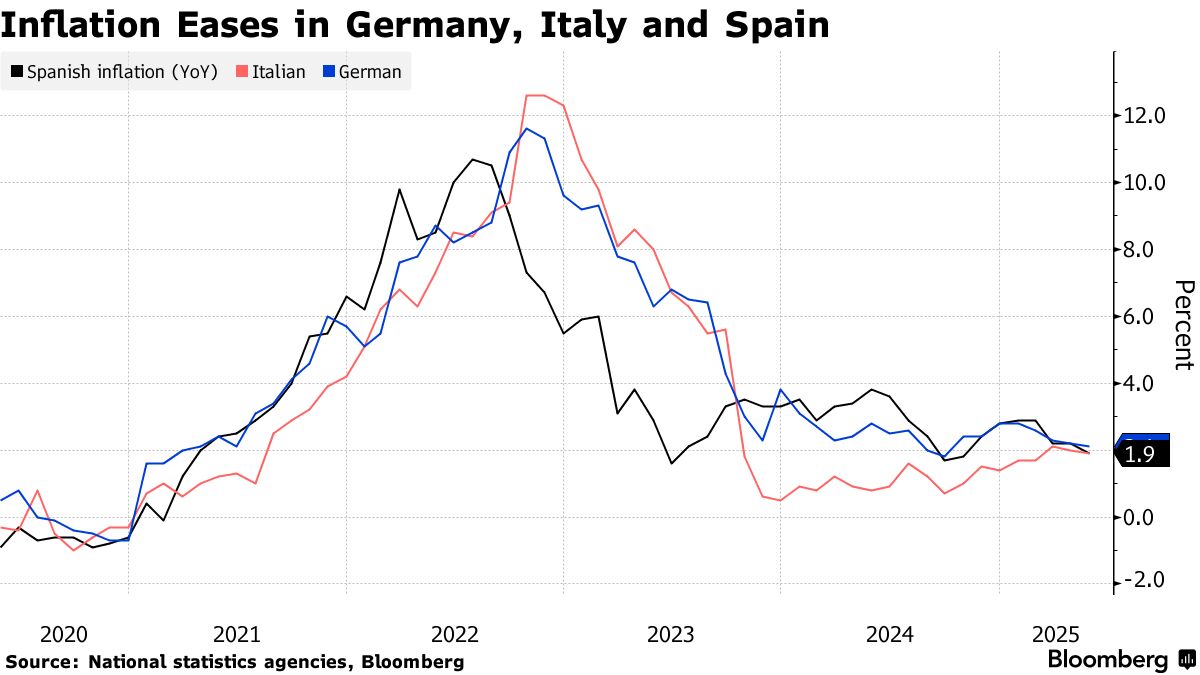 此前週五來自意大利和西班牙的報告顯示,兩國通脹率已降至略低於2%,這為進一步降低借貸成本提供了依據。週二法國公佈消費者價格同比僅上漲0.6%。