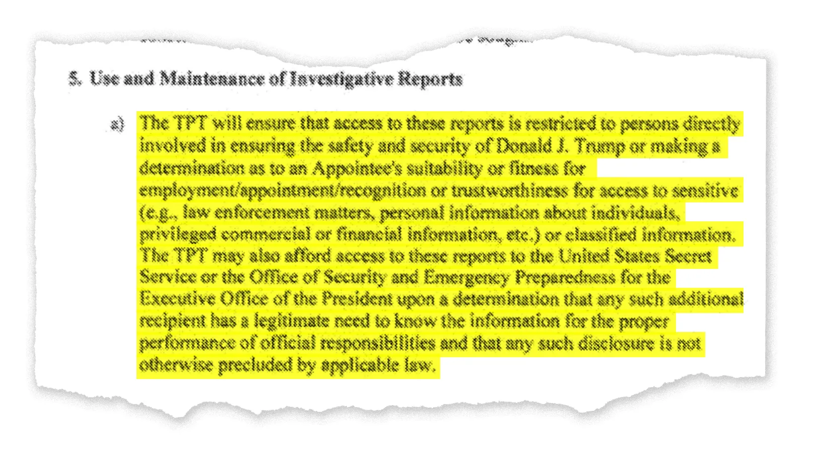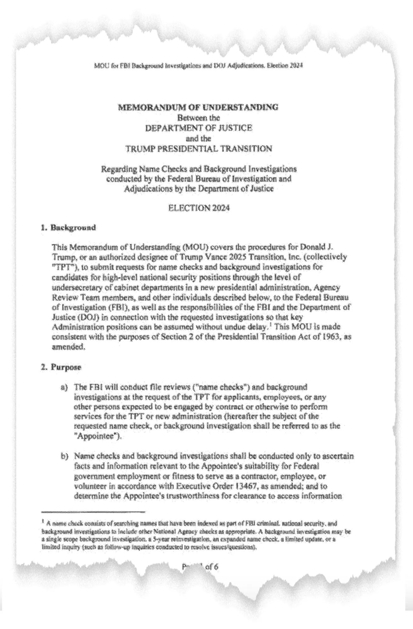 協議明確指出"姓名核查與背景調查僅用於核實與任命人員是否適合擔任聯邦政府職務、承包商僱員或志願者的相關事實信息”,並"評估其接觸機密信息的安全許可可信度”。FBI發現的所有不利信息均會形成報告,並曾與拜登政府的司法部共享,後者再通報給特朗普過渡團隊。
