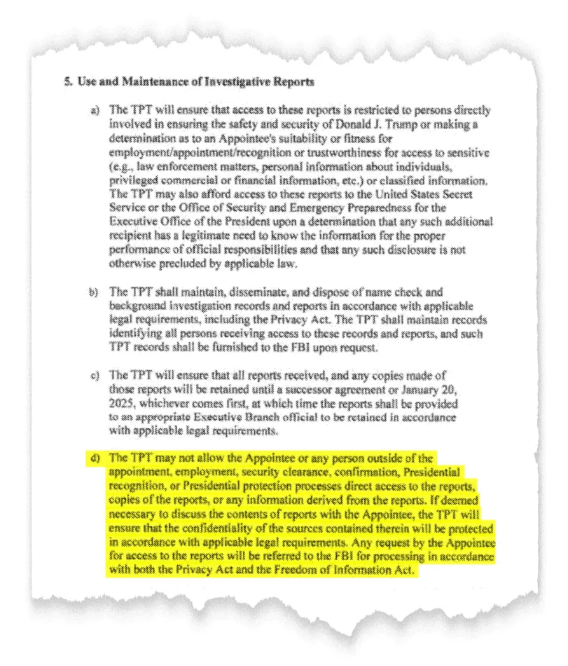 點擊此處查看文件(第4頁) 協議進一步規定,過渡團隊不得向被任命者或第三方分享聯邦調查局的背景調查報告。若被任命者想查閲報告,必須通過《信息自由法》申請獲取。