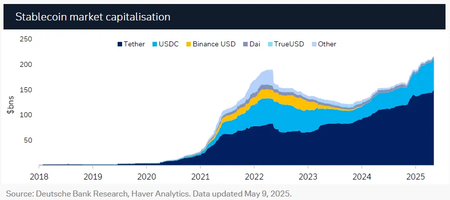 目前約83%的穩定幣錨定美元,主要由Tether的USDT和Circle的USDC主導。德意志銀行分析師指出,由於新興市場將這些資產作為對沖通脹和資本管制的工具,它們可能加速"非正式美元化"進程。