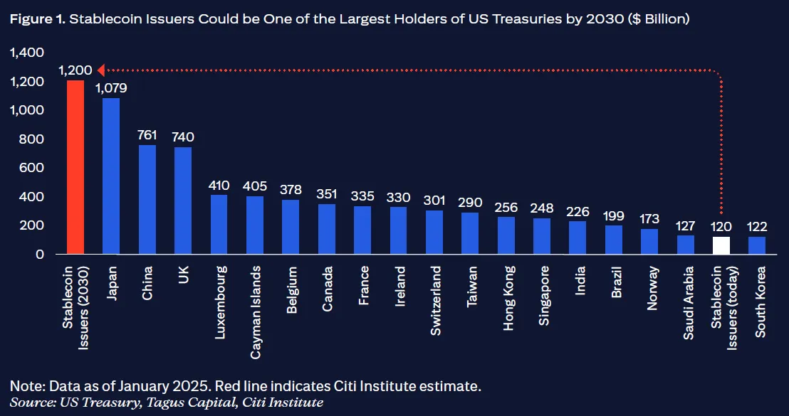 但花旗集團分析師Ronit Ghose等人在上月報告中表示,其基本預測是到2030年穩定幣將累計增持逾1萬億美元國債。摩根大通的最佳預估則顯示,未來幾年穩定幣可能持有約3500億至5250億美元的國庫券。