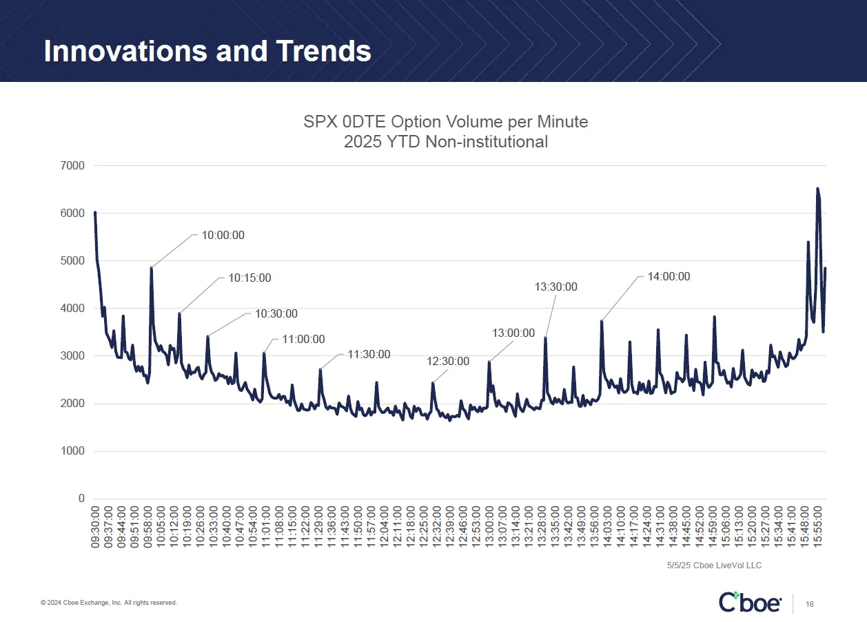 幻燈片上的圖表顯示了2025年以來每個常規交易時段每分鐘零日期權(這種超短期合約在某些交易日已佔標普500指數總交易量的一半以上)的交易量。數據顯示紐約時間上午10點整出現散户交易高峯,10:15、10:30和11點有較小峯值,下午2點則出現更大高峯。