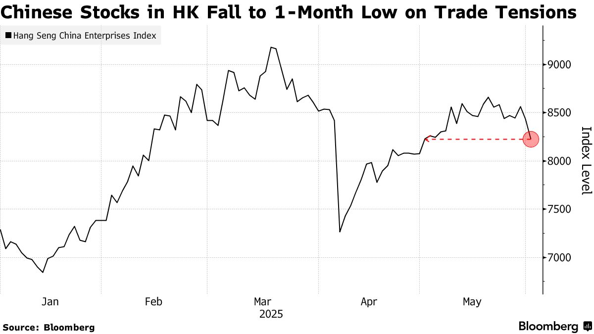 週一香港交易的中國股票下跌,因中美貿易緊張局勢升級打擊了市場情緒。