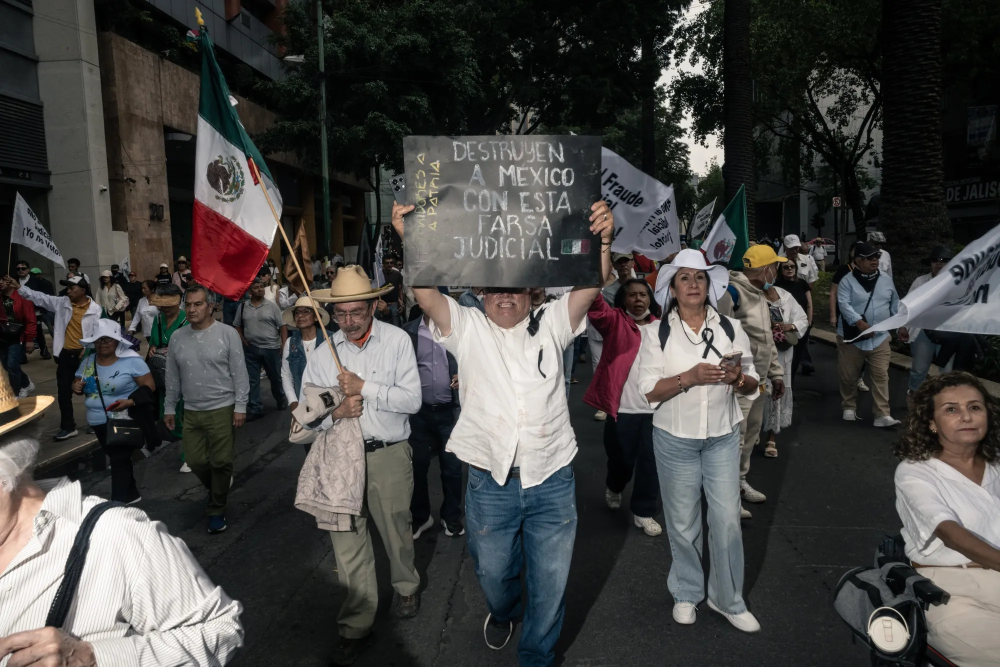 2025年6月1日週日,示威者在墨西哥城抗議司法選舉。攝影師:Mayolo Lopez Gutierrez/彭博社"這是場鬧劇。他們試圖愚弄民眾,並濫用權力控制司法系統,“63歲的工程師羅伯託説道,他88歲的母親羅西奧也參與了遊行。因擔心報復,他們要求隱去姓氏。