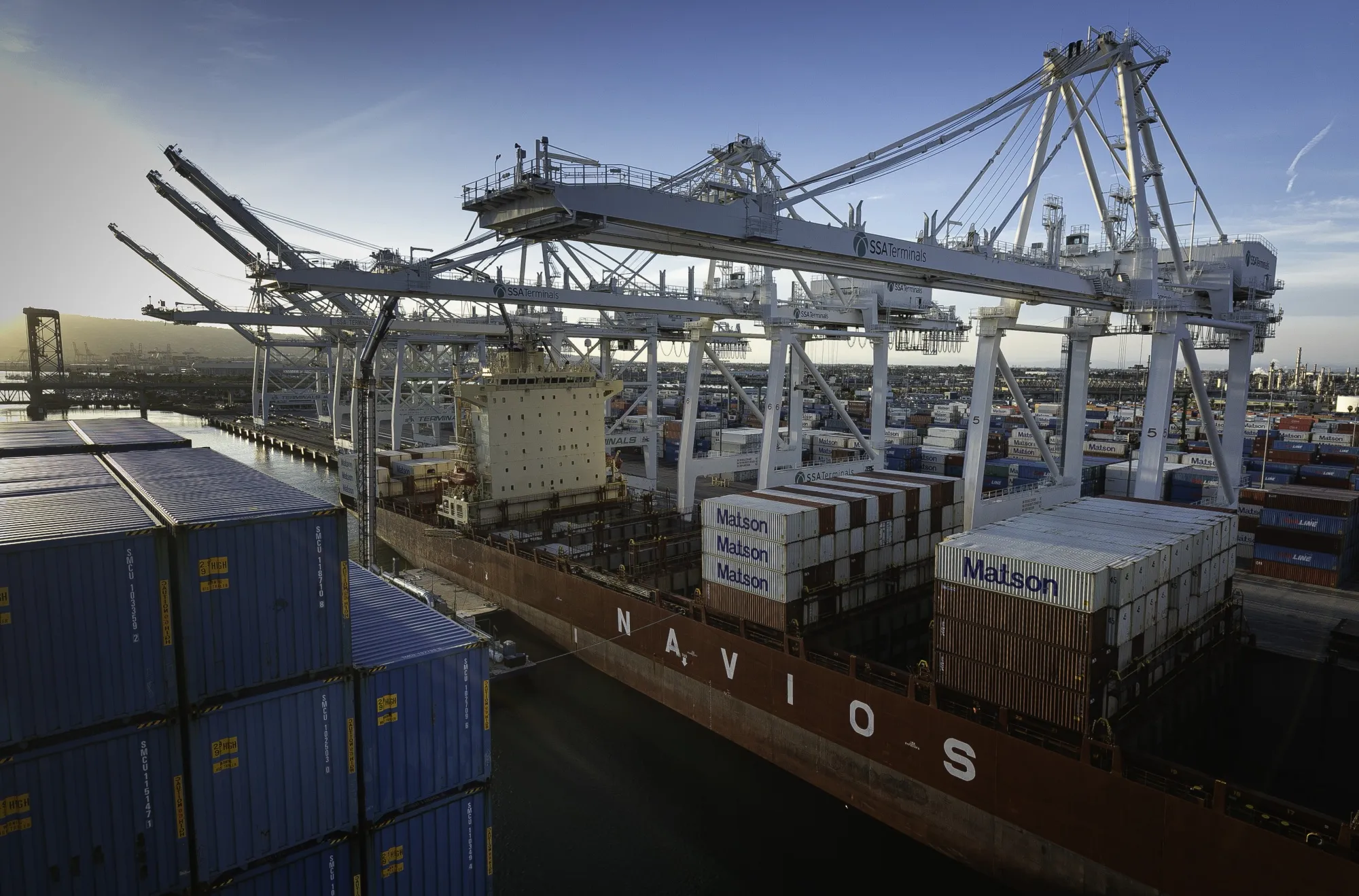 一艘集裝箱船駛離加利福尼亞州長灘的長灘港。