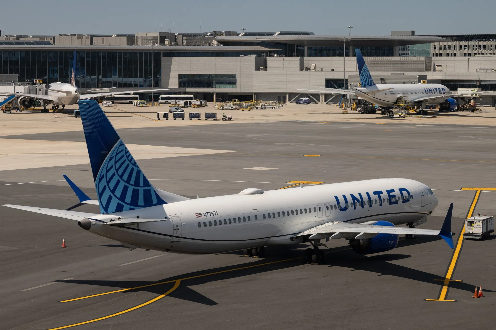 6月2日,美國聯合航空公司一架波音737 MAX客機停靠在新澤西州紐瓦克自由國際機場(EWR)的停機坪上。