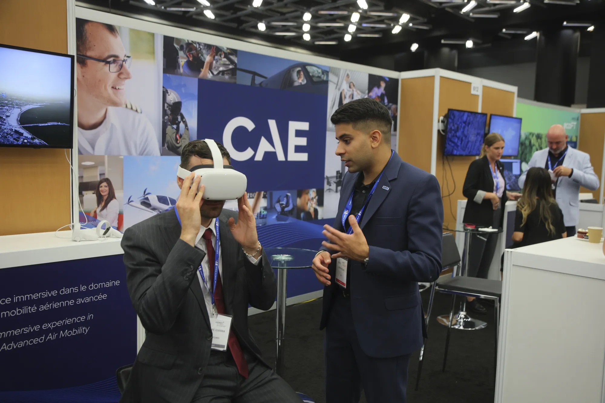 2022年國際航空航天創新論壇上,一名參會者正在體驗eVTOL(電動垂直起降飛行器)虛擬現實頭顯設備。