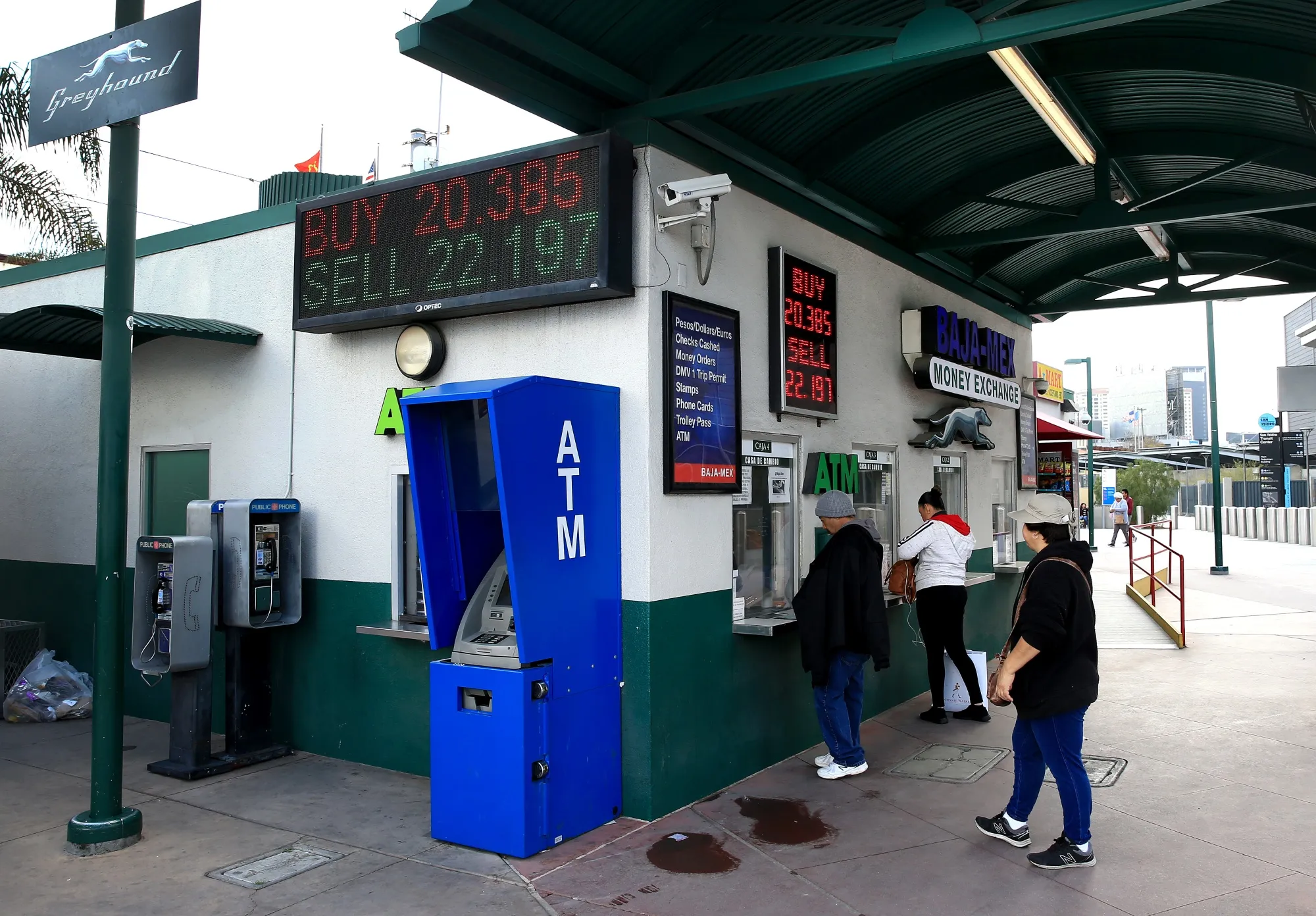美國加州聖地亞哥聖伊西德羅口岸海關與邊境保護局外的貨幣兑換點顧客。