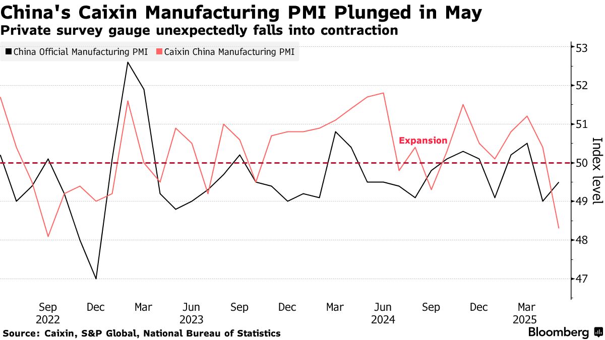 以出口導向型企業為調查對象的財新PMI,展現了中美自5月14日起達成90天關税休戰後,工廠在初期調整狀態的另一幅圖景。