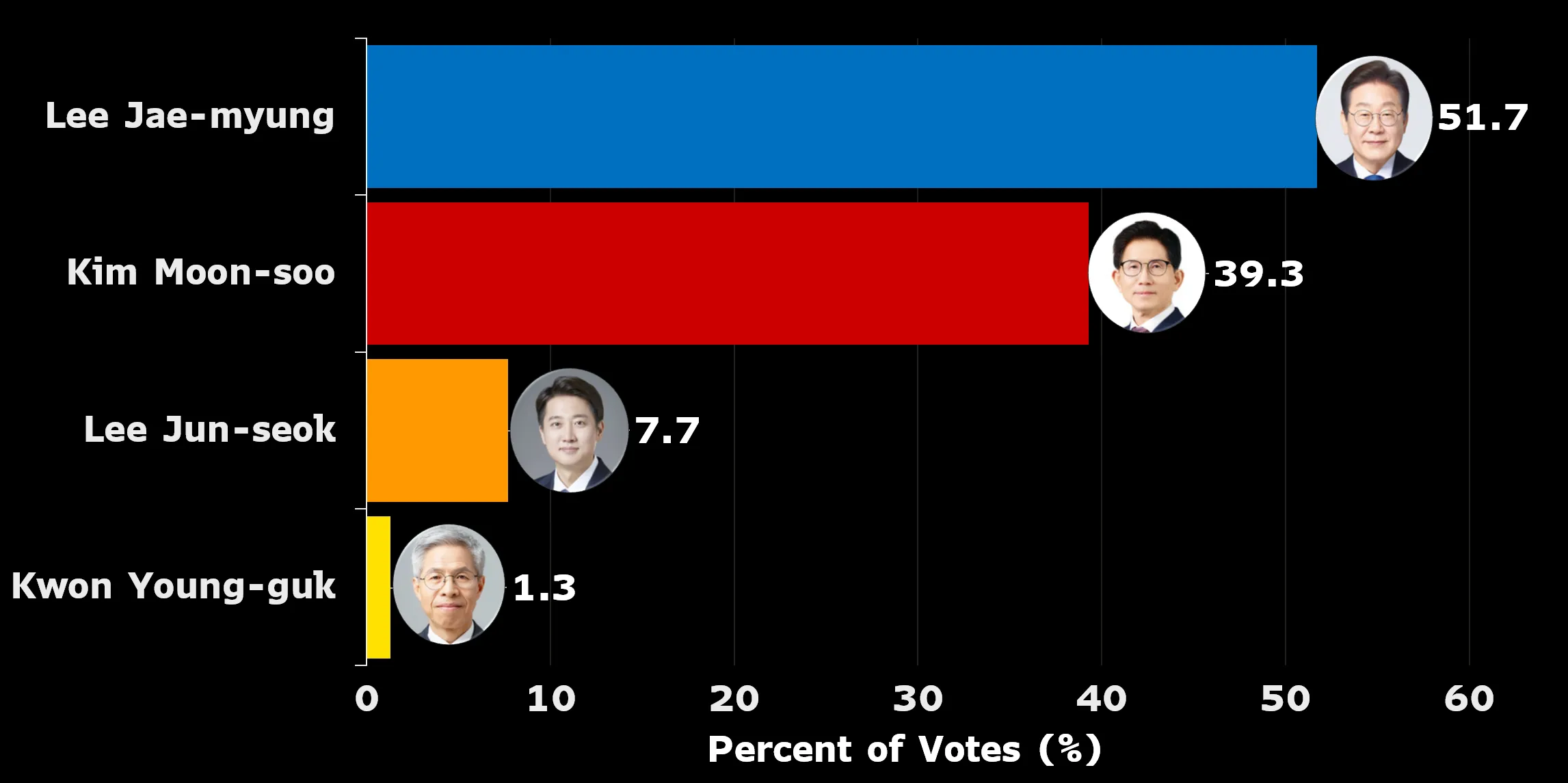根據韓國三大廣播公司KBS、MBC、SBS週二聯合進行的出口民調,李在明預計將獲得51.7%的選票。他的主要對手、執政黨國民力量黨候選人金文洙預計將獲得39.3%的選票,這項對8萬多名選民的調查顯示。