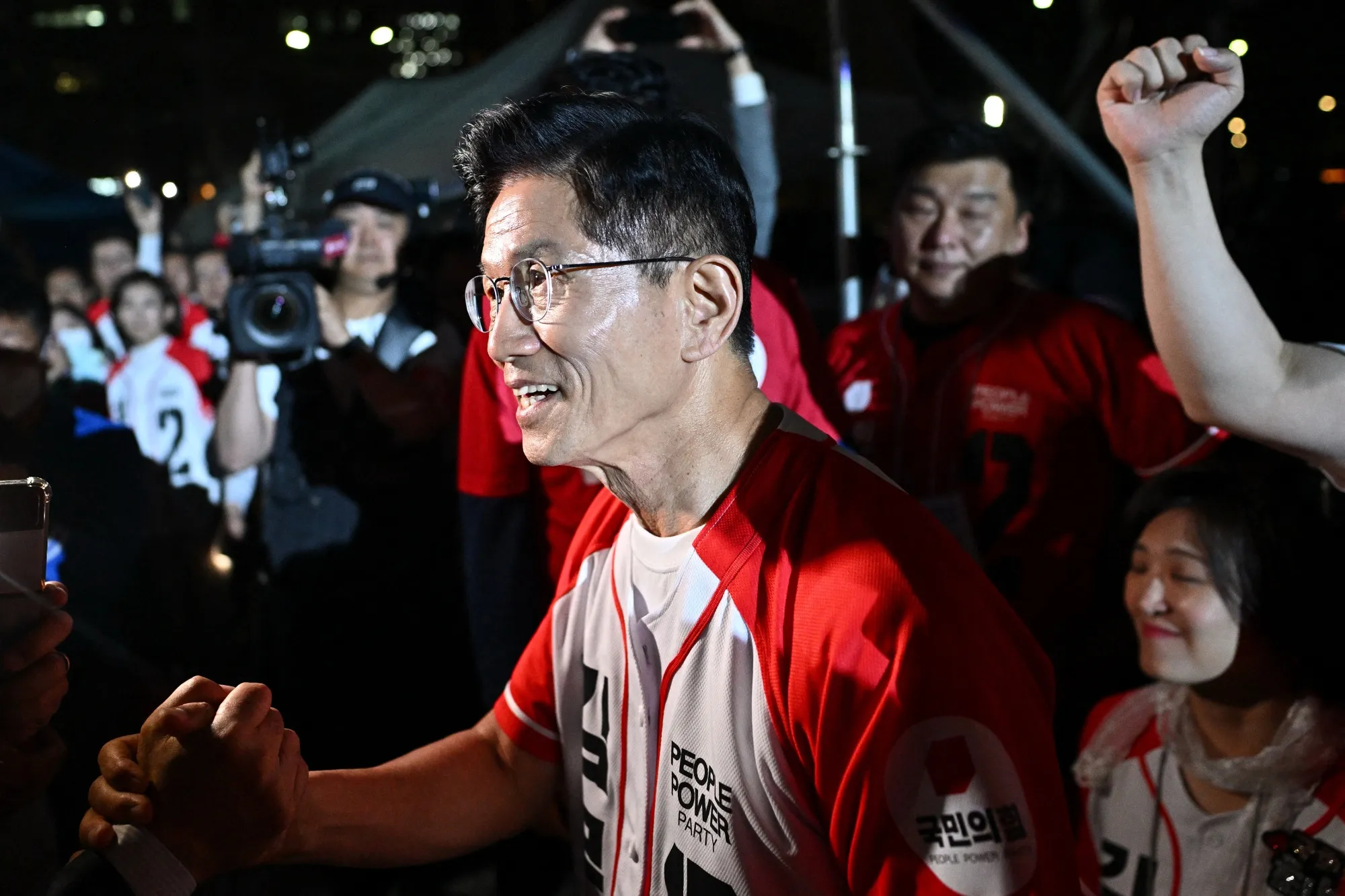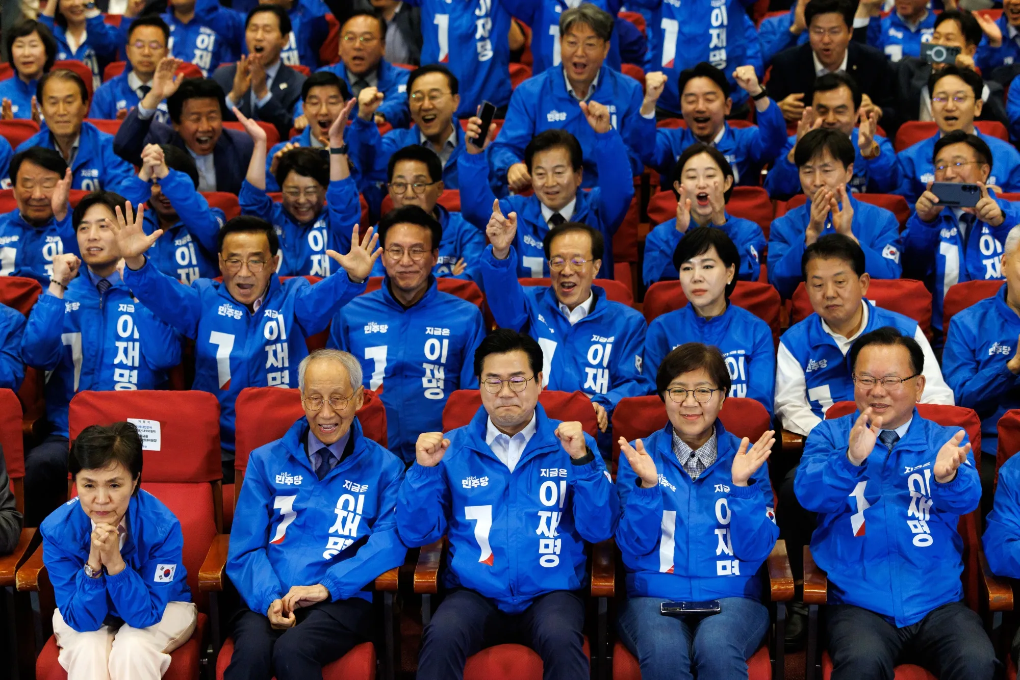 共同民主黨代黨首樸完洙(前排中)與黨員觀看計票結果時的反應。攝影師:趙成俊/彭博社執政黨國民力量黨發言人申東旭接受YTN採訪時,似乎已承認敗選。他聲音嘶啞地表示出口民調低於預期,並遺憾該黨未能在投票前及時向公眾展現候選人優勢。