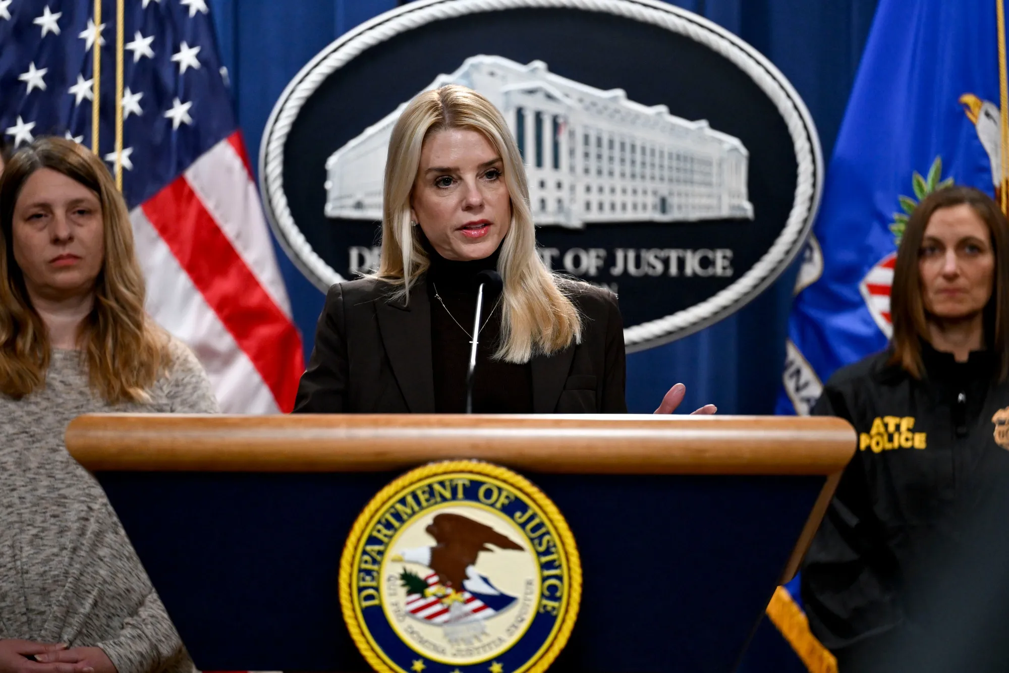 美國司法部長帕姆·邦迪於2025年2月12日週三在華盛頓特區司法部新聞發佈會發言。