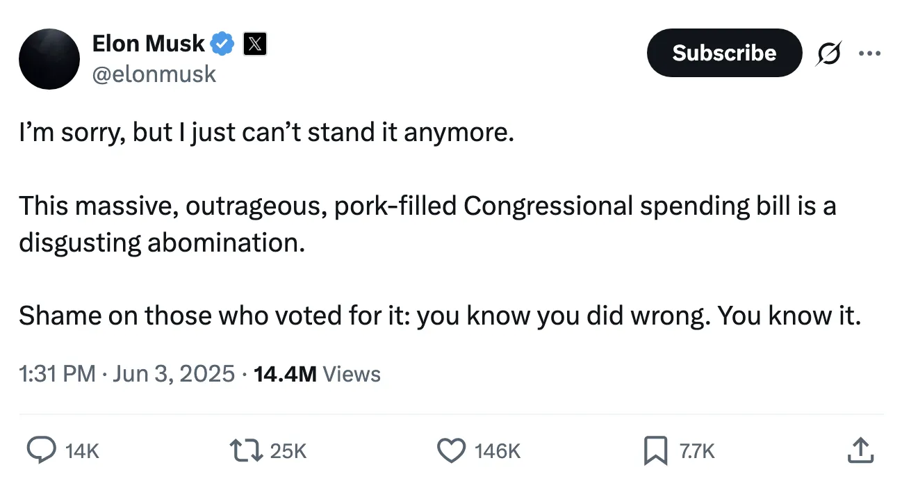 頗具諷刺意味的是,就在克萊夫·克魯克質問“抵制力量在哪裏?”以對抗特朗普激進野心的同一天,埃隆·馬斯克決定徹底決裂,終結與總統的兄弟情誼: