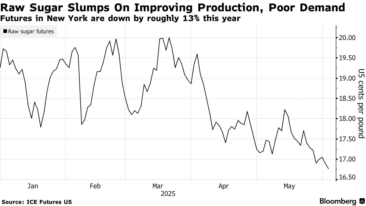 主力期貨合約週二下跌1.3%至每磅16.66美分(2021年6月以來最低)後收窄跌幅。由於供應改善,今年價格已下跌近13%,市場預計2025-26年度全球將出現過剩。