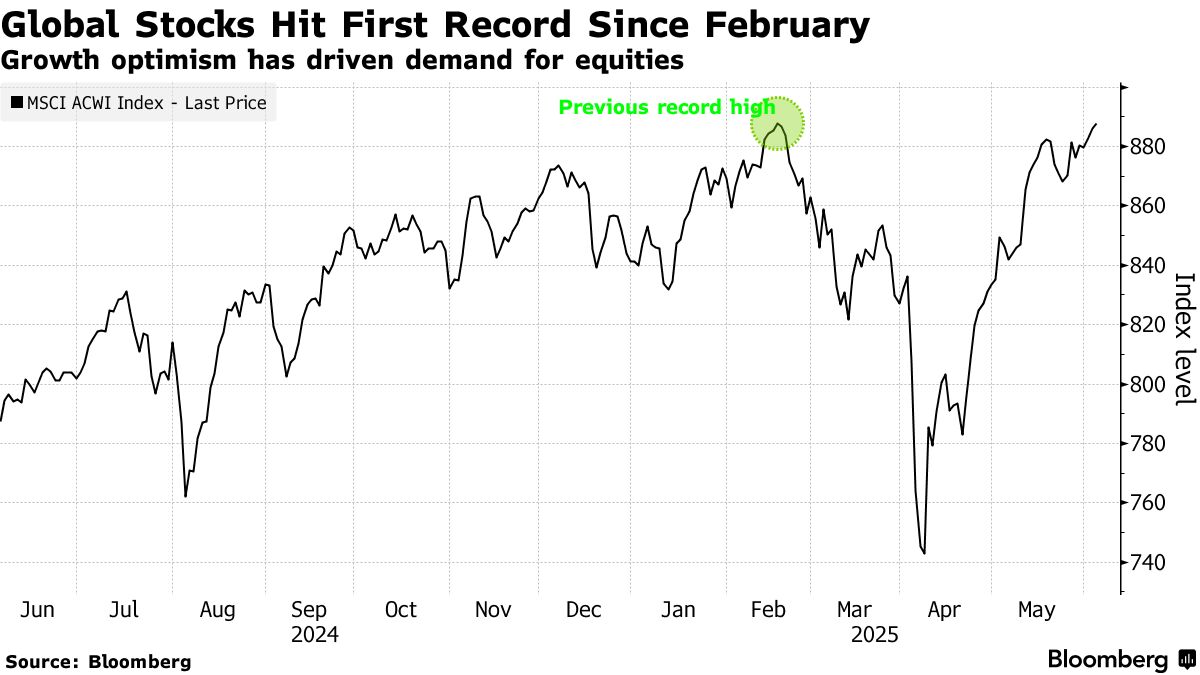 全球股市自2月以來首次創下歷史新高,因經濟韌性跡象蓋過了貿易談判的不確定性。