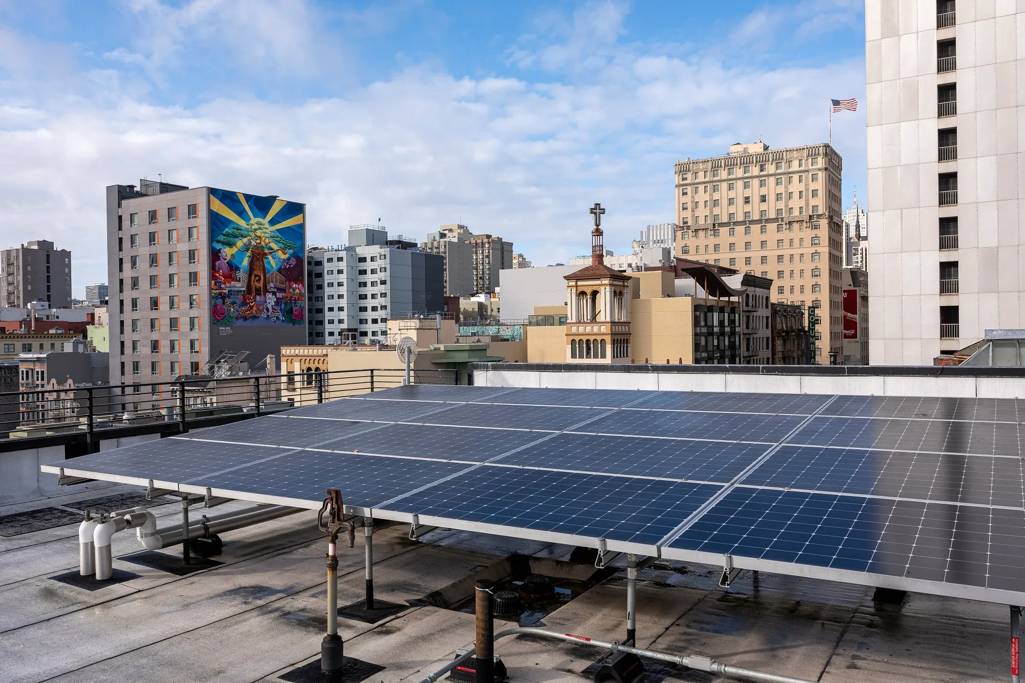 舊金山一處住宅區屋頂的太陽能系統。根據新提案,太陽能板購買者將失去部分激勵措施。