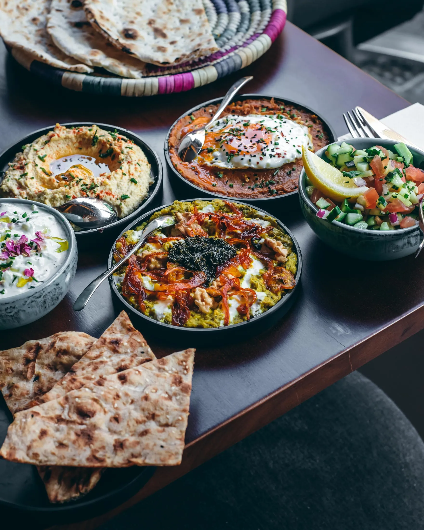 納魯恩餐廳供應包括鷹嘴豆泥、卡什克巴德姆醬(茄子蘸醬)、設拉子沙拉和桑加克麪包在內的各式菜餚。圖片來源:納魯恩 納魯恩,馬裏波恩及其他分店