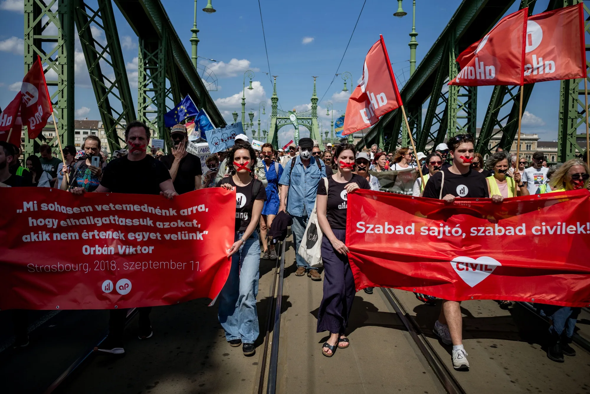6月1日布達佩斯示威活動中,抗議者高舉"新聞自由、NGO自由"標語。