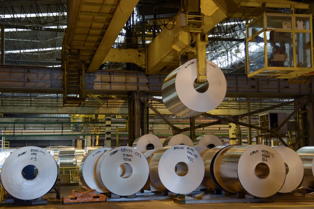 2015年,巴西平達蒙漢加巴,諾貝麗斯公司工廠內一名操作員正用起重機搬運鋁卷。