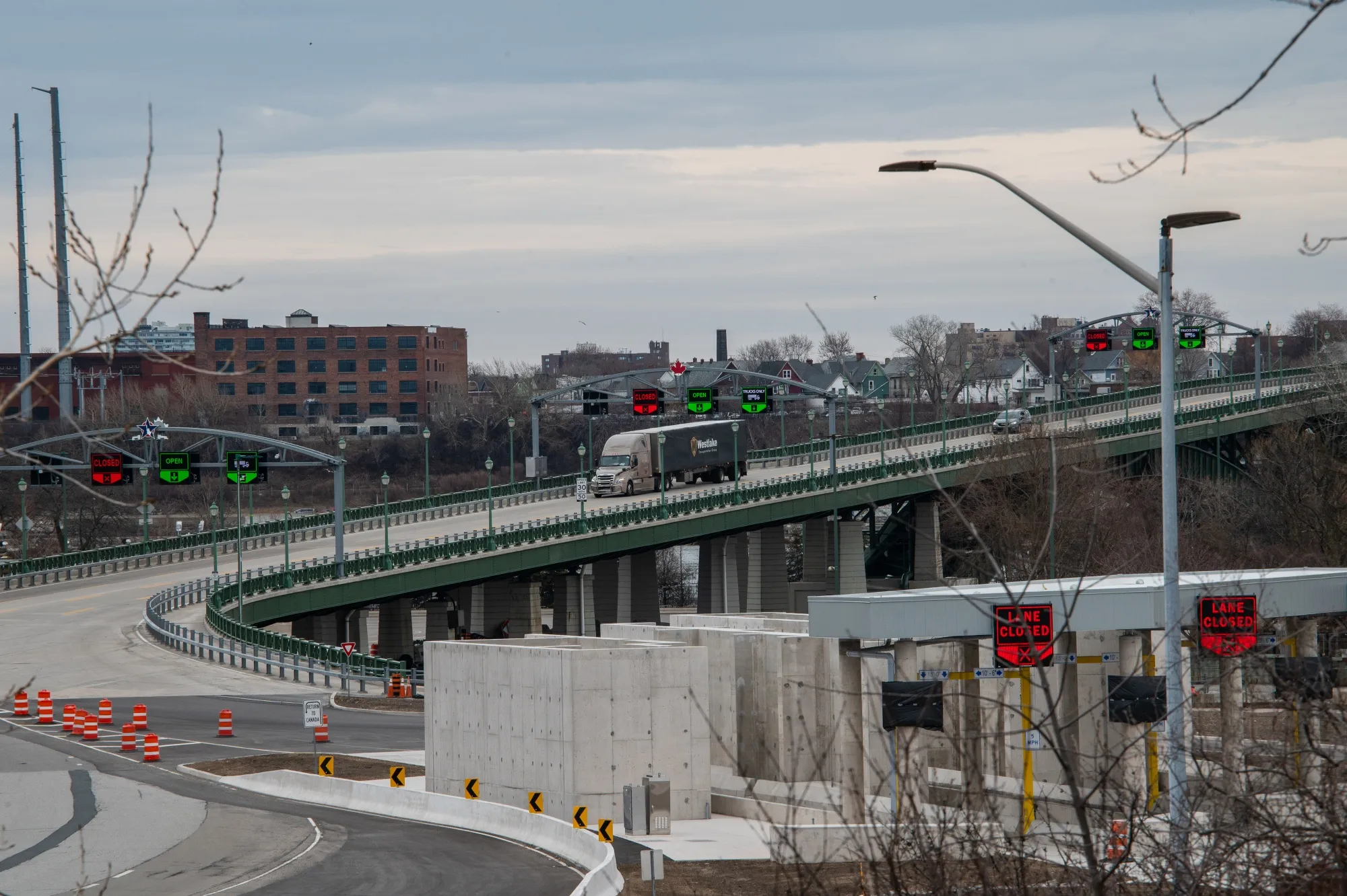 一輛卡車駛過加拿大安大略省伊利堡美加邊境的和平橋。