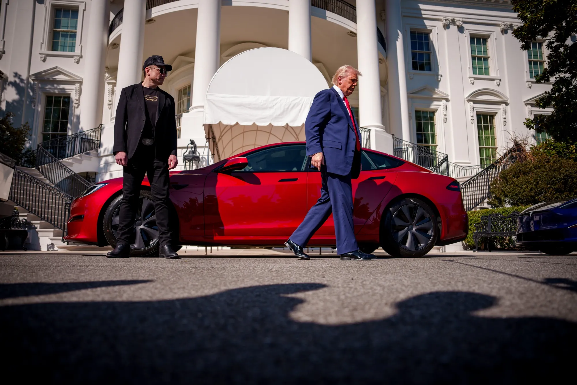 3月11日,唐納德·特朗普與埃隆·馬斯克走過白宮南草坪上的一輛特斯拉Model S。