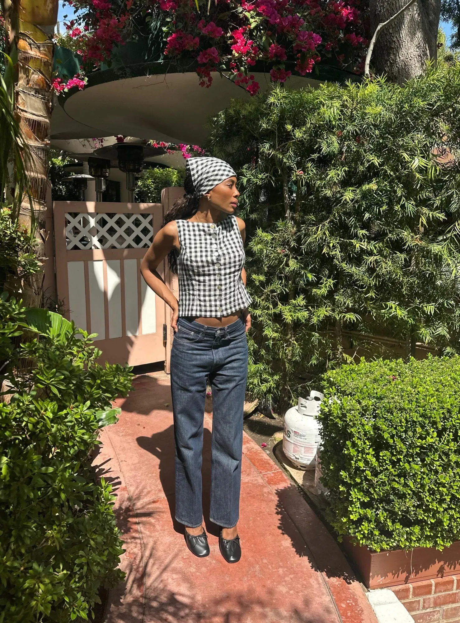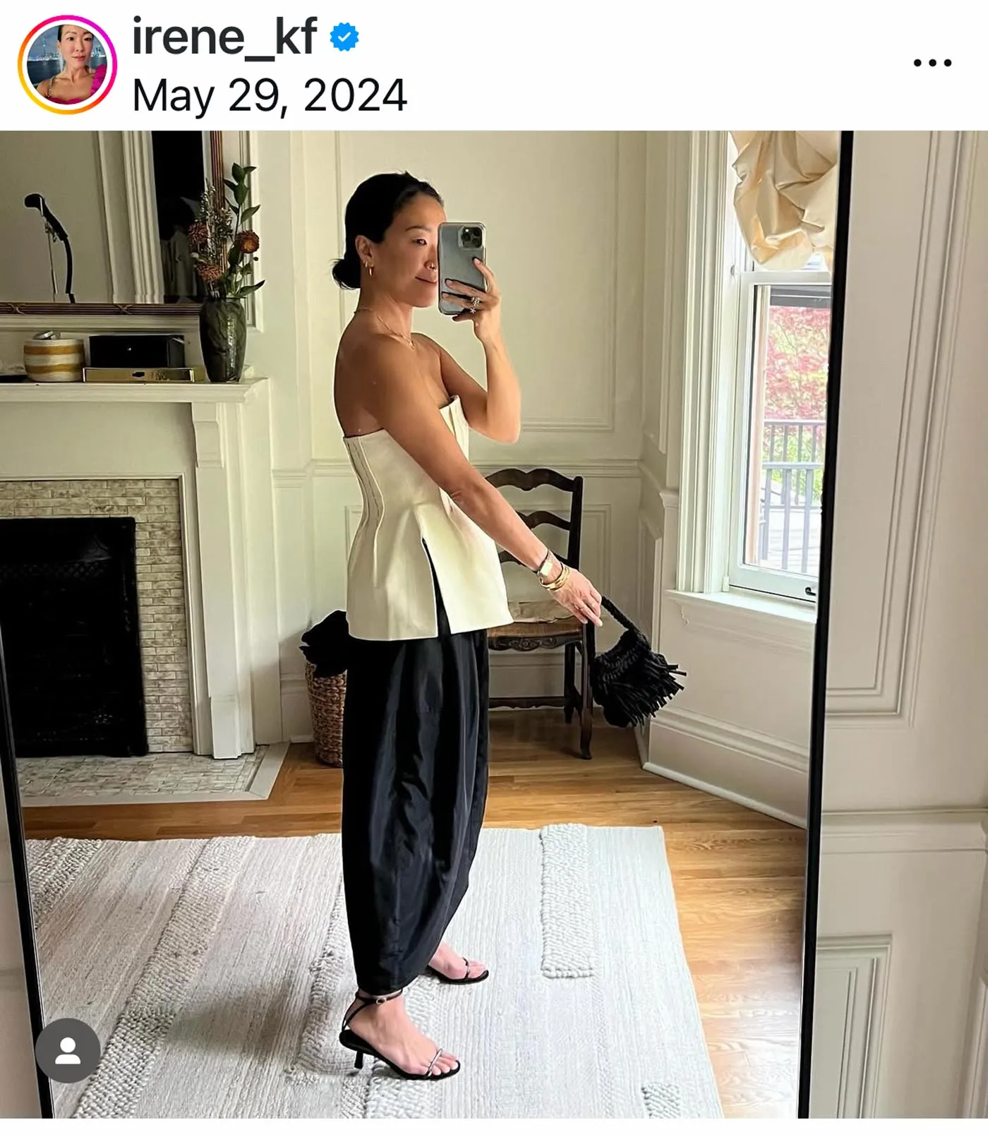 Kim的上衣與褲裝均採用吸睛剪裁比例來源:@irene_kf/Instagram洛杉磯造型師Mecca Cox認為,讓基礎款煥發魅力的核心在於平衡剛柔元素。“要始終考慮對立元素的並置,“她解釋道。其標誌性造型常以男士襯衫搭配精裁長褲,腳踩芭蕾平底鞋或細帶涼鞋。