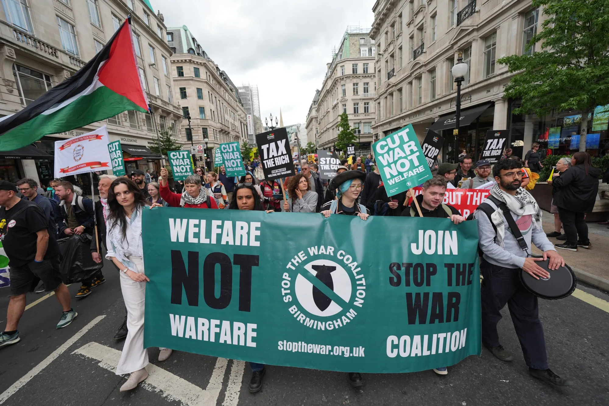 在波特蘭廣場的遊行起點處,可以看到來自全國教育聯盟、革命共產黨、綠黨以及鐵路、海事和運輸工會(RMT)的代表。