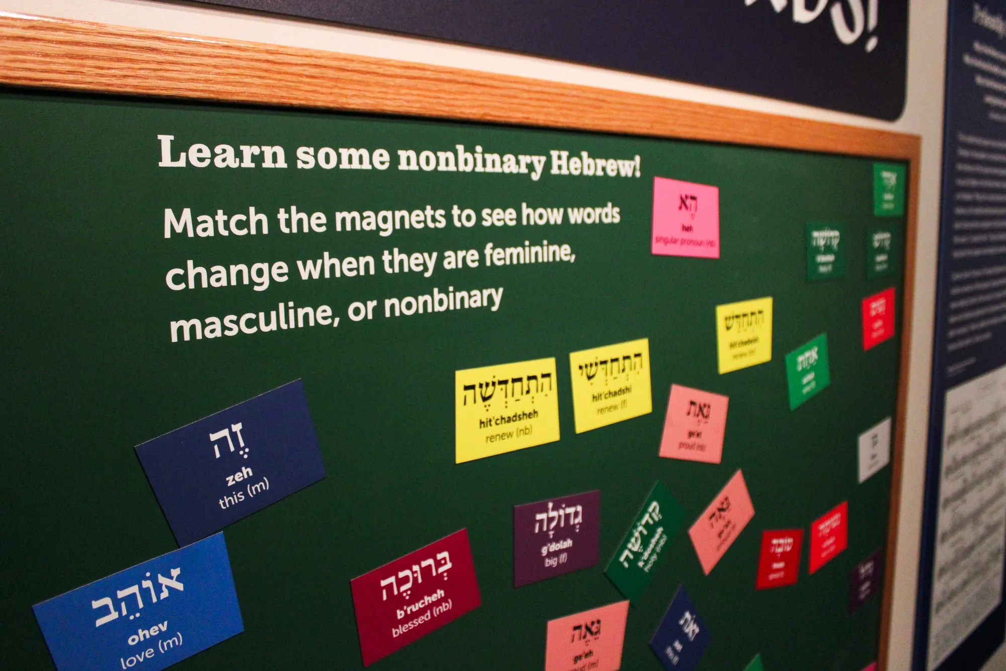 攝影師:首都猶太博物館提供“LGBT猶太人”展覽展示了華盛頓特區同性戀和猶太人生活中一些較為著名的標誌,例如由活動家拉里·克萊默和ACT UP推廣的《沉默=死亡》集體海報。基思·哈林為華盛頓艾滋病遊行設計的徽章和海報是經久不衰的藝術作品。然而,展覽中最感人的展品是一些更簡單的信仰物品,比如1982年華盛頓逾越節家宴上使用的手繪猶太女同性戀女權主義哈加達。