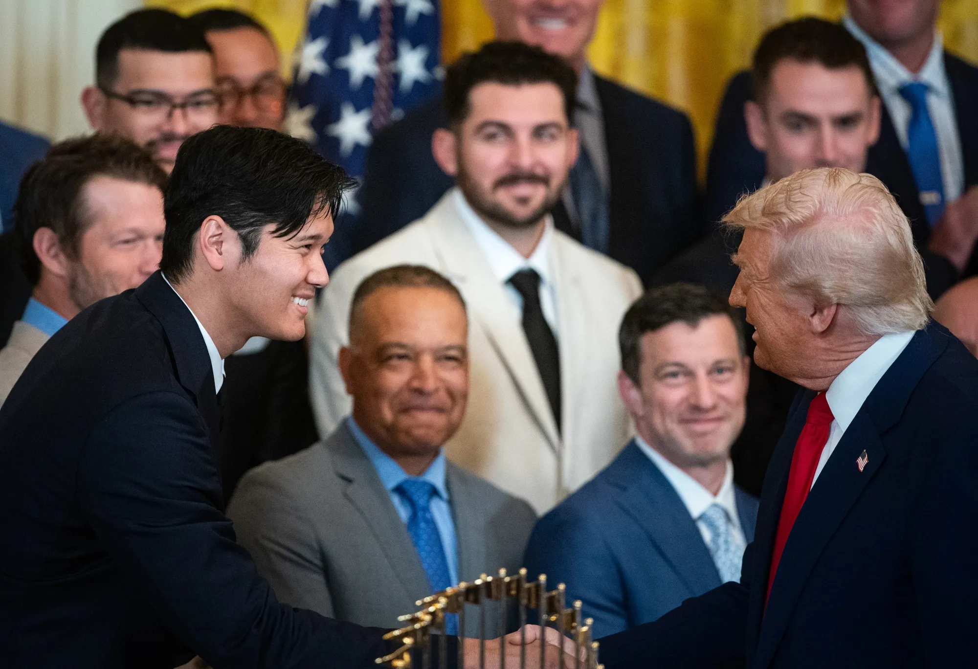 2025年4月7日週一,美國總統唐納德·特朗普(右)與洛杉磯道奇隊投手大谷翔平在華盛頓特區白宮東廳握手。特朗普邀請洛杉磯道奇隊到訪,以慶祝他們贏得2024年世界大賽冠軍。