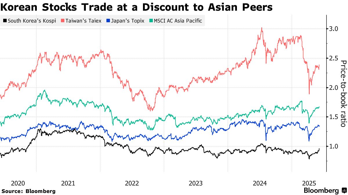 多年來,在諸如市淨率等衡量股票價值與公司資產價值之比的流行指標上,韓國股市一直比近鄰日本和台灣更為便宜。“韓國折價"現象並非單一原因所致,但分析師指出,這源於對企業投資方式的擔憂、錯綜複雜的交叉持股網絡,以及公司高管利益與股東利益並不總是一致的感覺。