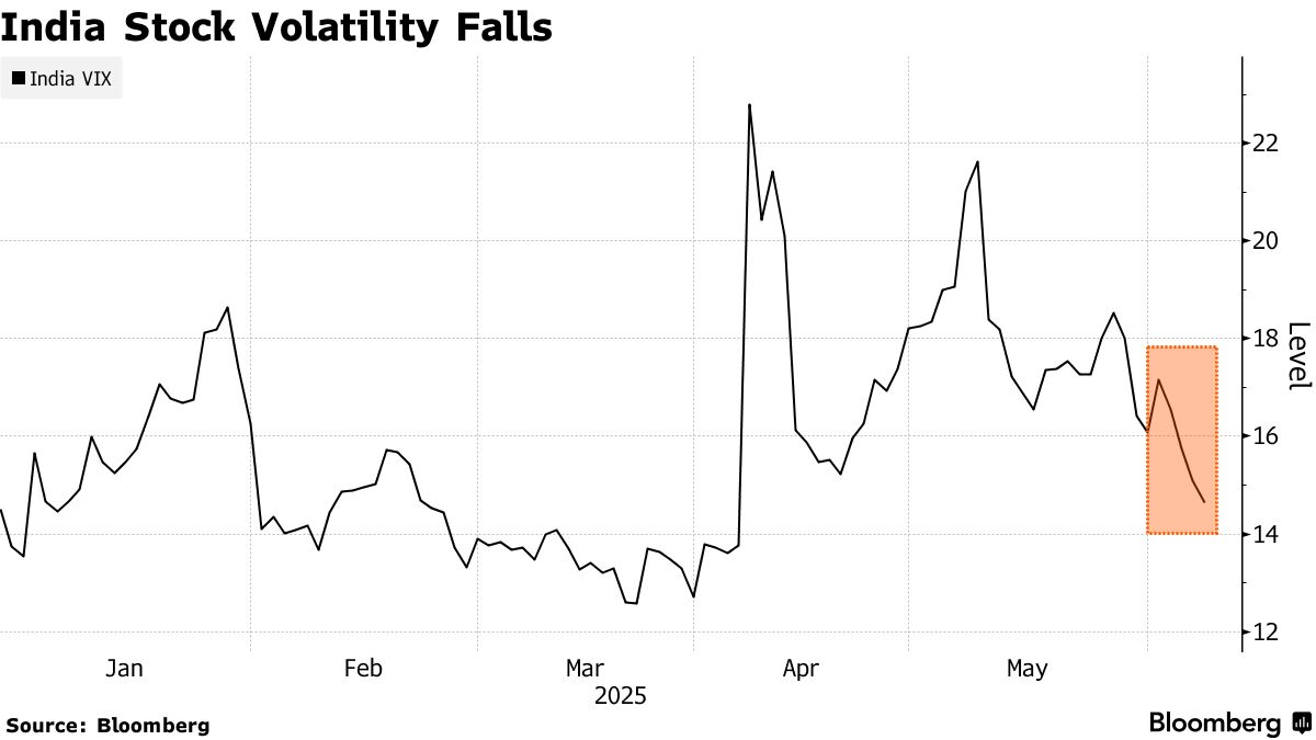 儘管Nifty 50未能突破5月15日高點,但上月外國投資者向印度股市注入17億美元,創下去年9月以來最大單月流入,國內基金公司更是增持79億美元。上週在印度央行決議後,Nifty 50創下五月中旬以來最大漲幅,印度NSE期權波動率指數較4月高點回落8.2個點。