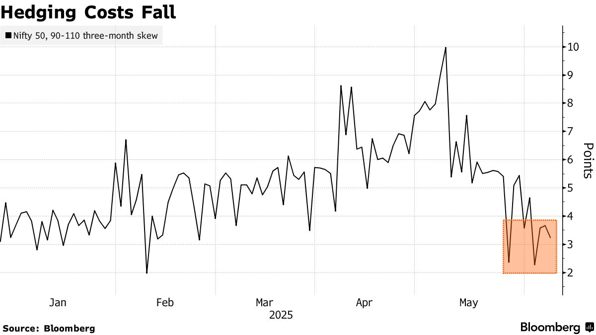 摩根大通的衍生品策略師在利率決議前就已持樂觀態度。他們在6月3日的報告中指出,印度處於有利的週期位置,且Nifty 50波動率將進一步下降的押注有充分依據。該機構重點推薦了看漲策略,並與美國銀行共同為希望保護股票持倉的投資者提供了一些潛在的低成本對沖方案。