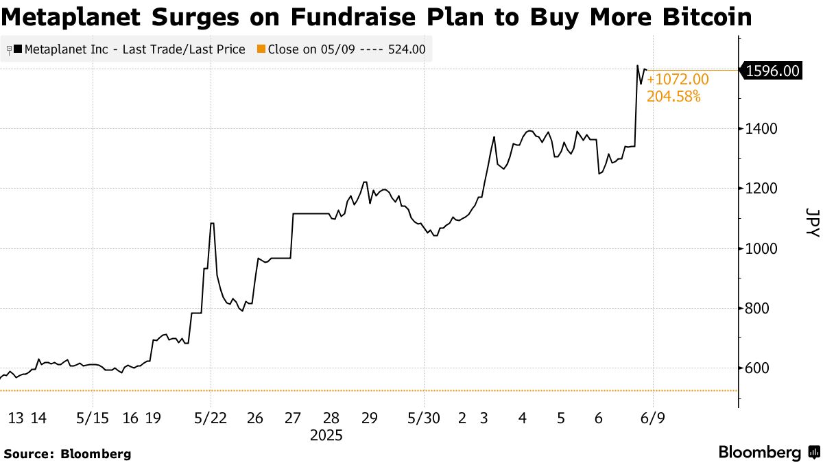 Metaplanet公司計劃籌集約54億美元資金,用於增持比特幣儲備(其現有比特幣持倉價值已接近10億美元),該消息推動該公司股價在週一大幅攀升。