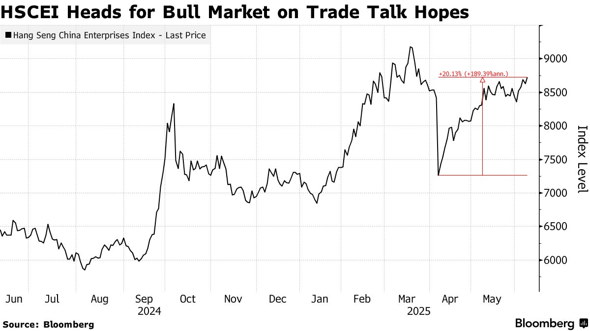 4月初全球股市動盪,當時美國總統唐納德·特朗普宣佈全面加徵關税,引發全球兩大經濟體之間迅速升級的關税行動。但對大部分關税的90天暫停期幫助消除了投資者的最大擔憂——至少目前如此——焦點已轉向達成更廣泛協議的可能性。兩國代表週一在倫敦舉行會談。
