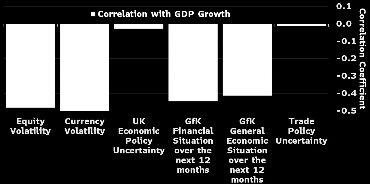 來源:彭博經濟。注:圖表中GfK指標已進行反向處理以便比較。相關性樣本區間為2000年至2019年。來源:彭博智庫彭博經濟研究顯示,不確定性的激增並不總會對英國經濟造成短期重大沖擊。英國首席經濟學家丹·漢森指出,歷史數據表明,政策不確定性指標的飆升"與GDP增長的相關性,不如反映金融市場波動的指標或捕捉經濟前景預期的調查指標那麼緊密"。