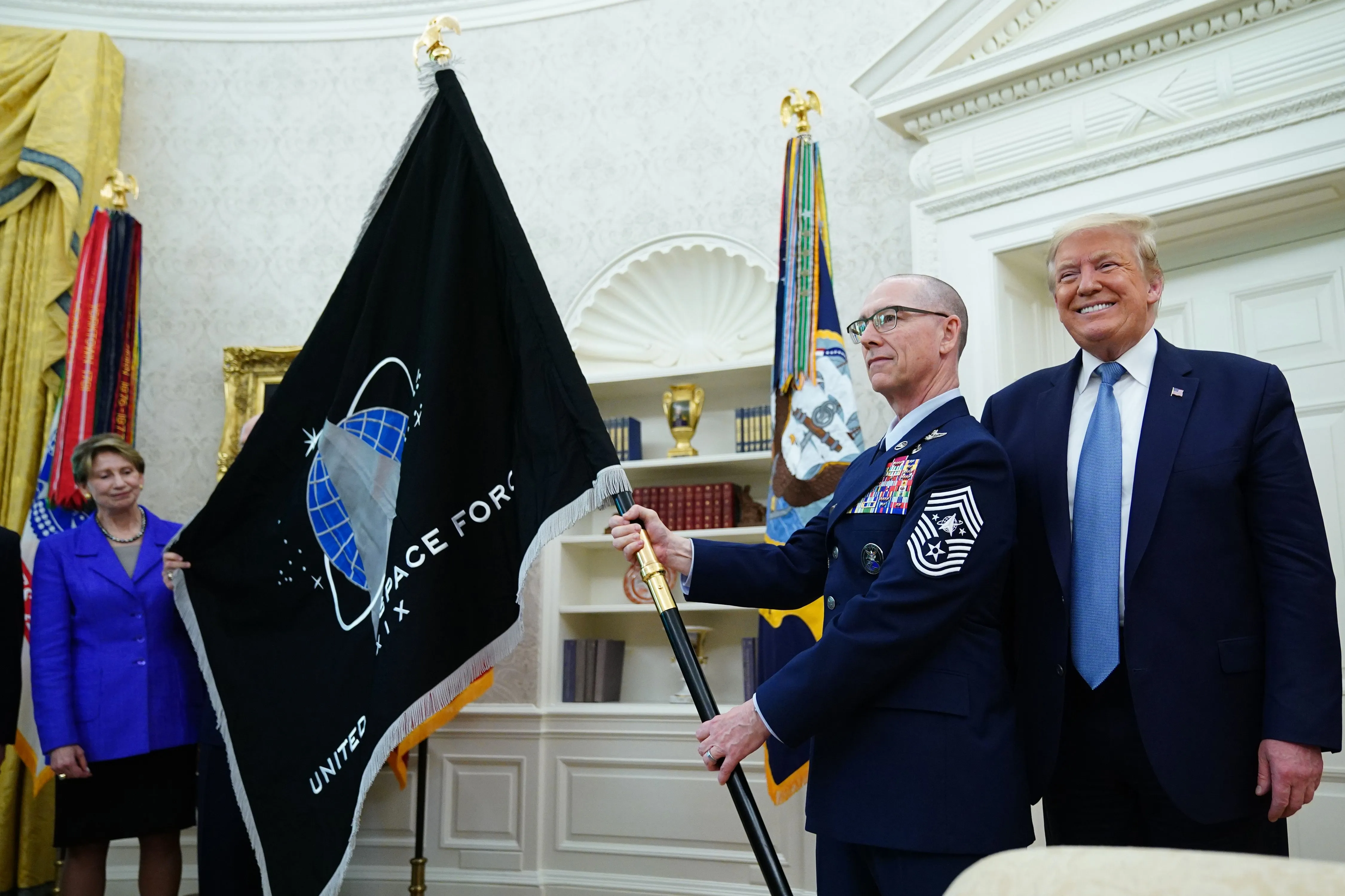 2020年,美國總統唐納德·特朗普在白宮舉行的儀式上展示太空軍新旗幟。攝影師:Mandel Ngan/AFP/Getty Images美國太空軍成立五年後,這個在特朗普首個總統任期內誕生的軍種曾因其《星際迷航》風格徽章引發調侃,並催生了史蒂夫·卡瑞爾主演的網飛情景喜劇,但至今仍在尋求外界認可。