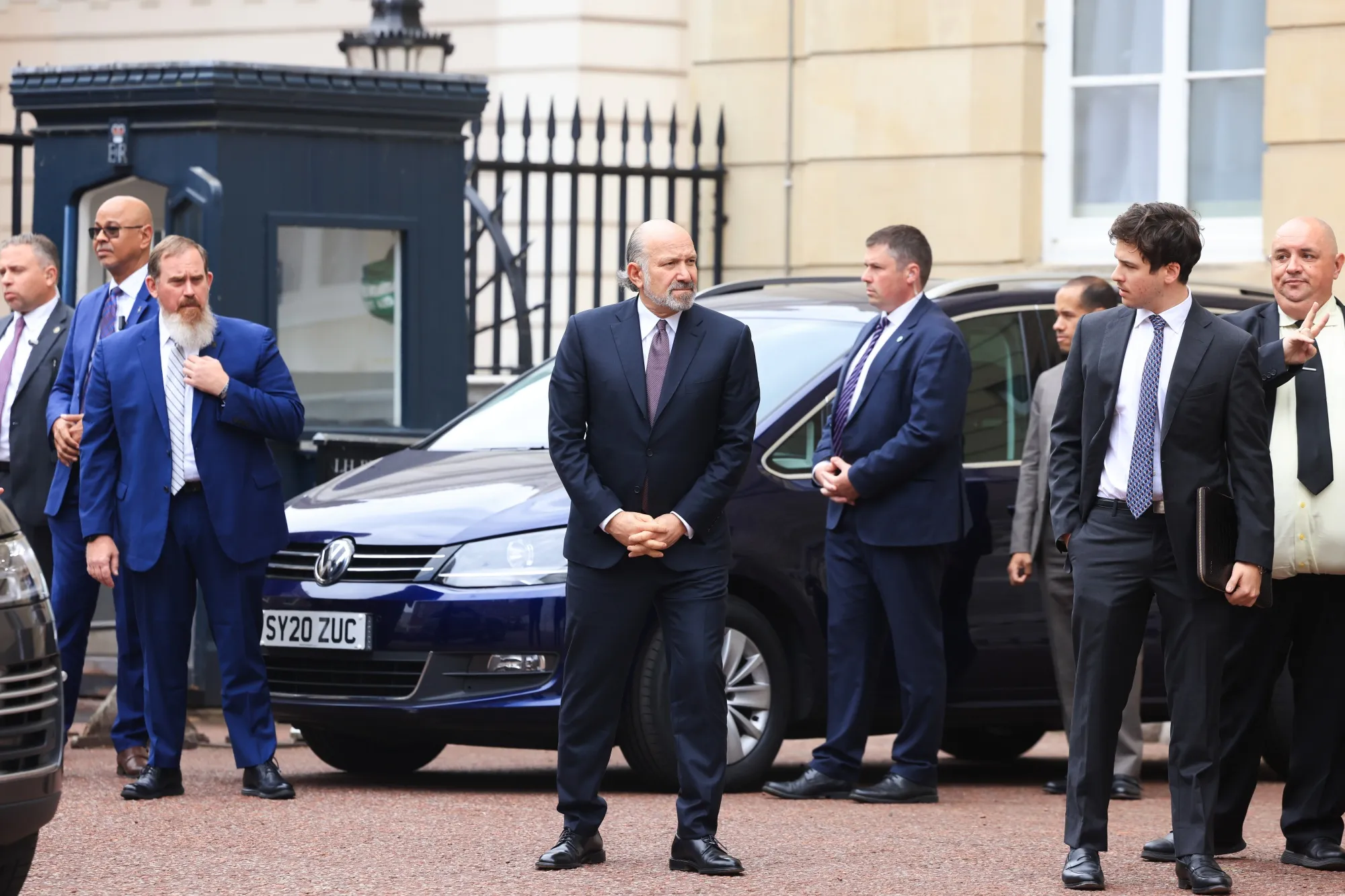美國商務部長霍華德·盧特尼克(中)抵達倫敦蘭卡斯特宮參加貿易談判