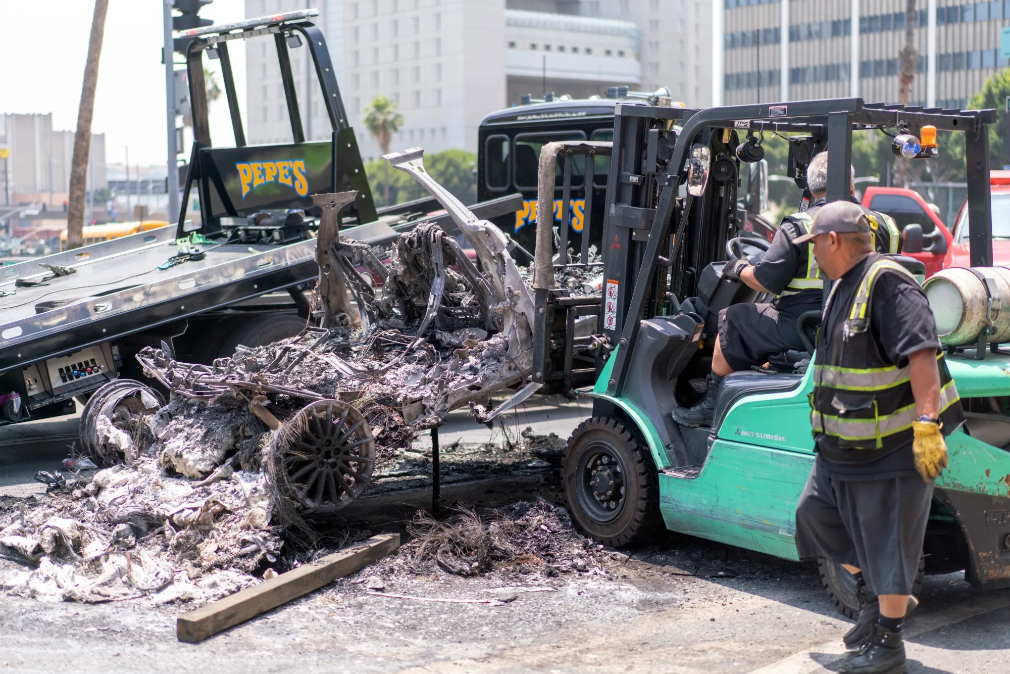 2025年6月9日週一,美國加州洛杉磯,工作人員正在清理一輛被焚燬的Waymo自動駕駛汽車。攝影師:凱爾·格里洛特/彭博社華納兄弟探索公司宣佈將分拆為兩家上市公司,計劃於年中前完成流媒體與影視製作業務同電視網絡運營業務的分離。