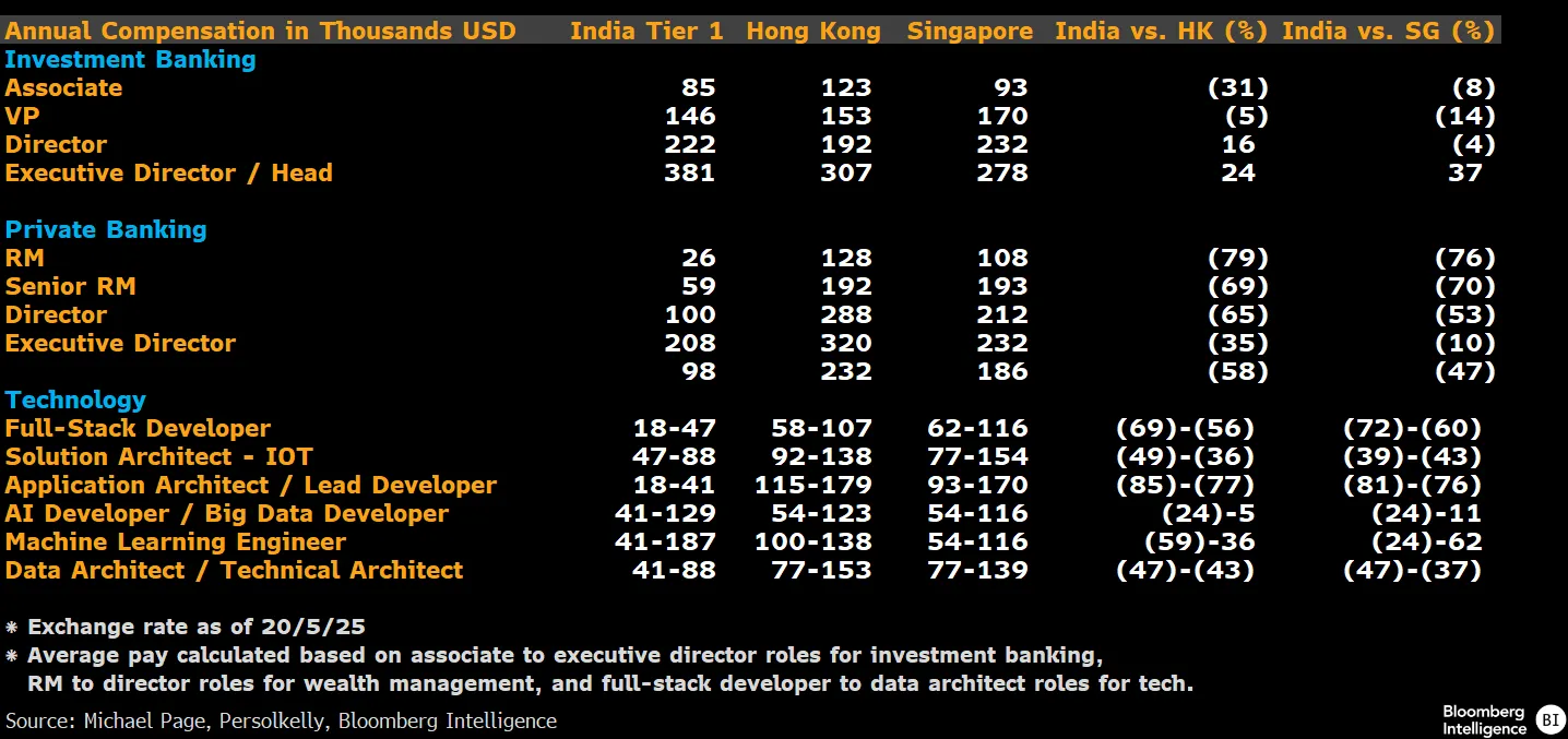 在孟買、印度自貿區GIFT城等主要金融樞紐,投行負責人與董事的收入已超越區域同行。根據彭博智庫對獵頭公司米高蒲志調查的分析,印度投行高管的平均薪資比香港高出24%,較新加坡高出37%。
