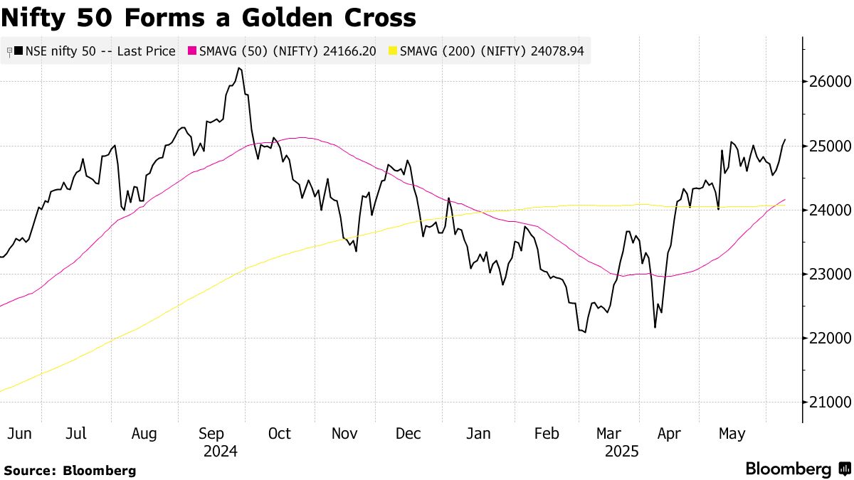 週一印度Nifty指數形成黃金交叉(即短期移動均線上穿長期均線的看漲技術形態),尋求本土股市繼續上漲佐證的交易員為之振奮。此次Nifty50日均線收於200日均線之上,這一信號歷史上往往預示強勁漲勢。2023年6月至2025年1月期間出現的類似交叉曾預示該指數漲幅高達42%。