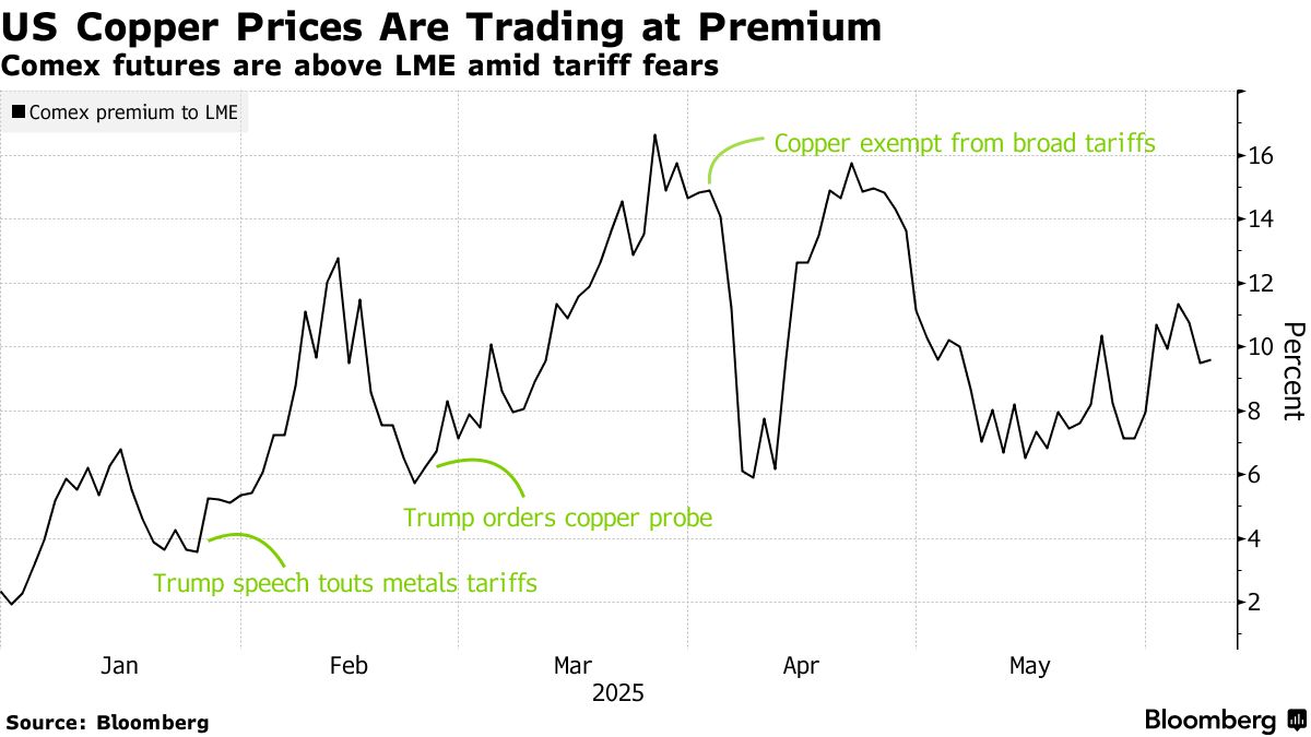 關税威脅已推動美國銅價升至高於其他市場的水平。紐約商品交易所的銅價目前比倫敦金屬交易所高出約9.3%,這激勵交易商和生產商在潛在關税實施前繼續向美國輸送銅供應。