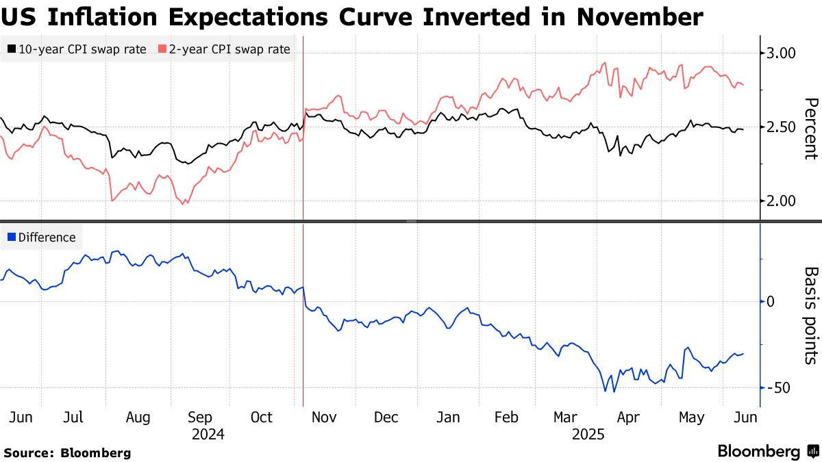 策略師建議通脹互換市場的客户做好準備,預計兩年期通脹互換利率(約2.79%)將回落至低於十年期利率(約2.48%)的水平。自美國大選日以來,短期通脹預期一直高於長期預期。