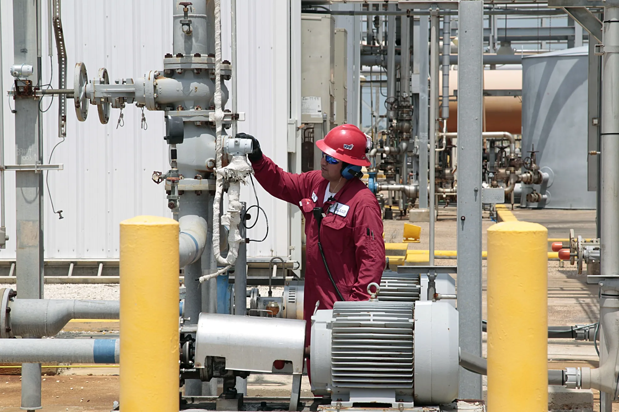 一名操作員在德克薩斯州阿爾文的Ascend Performance Materials巧克力灣工廠工作。