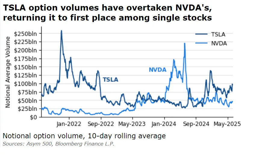 Asym 500創始人Rocky Fishman表示,特斯拉的隱含波動率(衡量對未來市場波動的預期)達到65%,是標普500指數前300只股票中最高的。他補充説,該公司的期權交易量已超過英偉達。