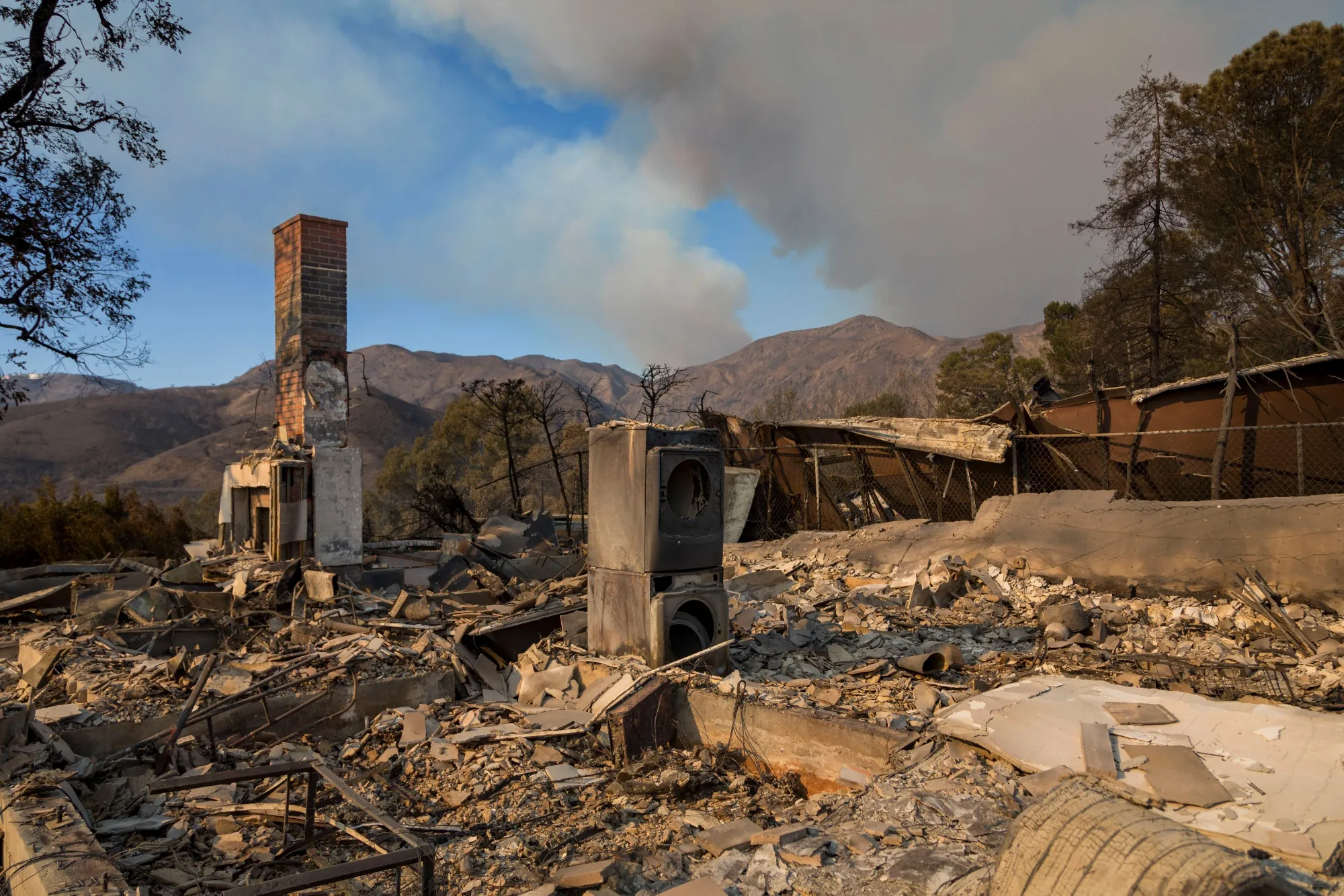 2025年1月10日週五,美國加州洛杉磯太平洋帕利塞德社區,帕利塞德山火過後,一棟被燒燬房屋廢墟中的洗衣機和烘乾機。攝影師:Michael Nigro/彭博社據我的同事Natasha White報道,加州地震局將代位求償權描述為"機會主義、利潤驅動的投資投機行為",並表示正計劃對抗"對沖基金和其他投機者",指控他們"正積極試圖從加州毀滅性的野火災難中牟利"。