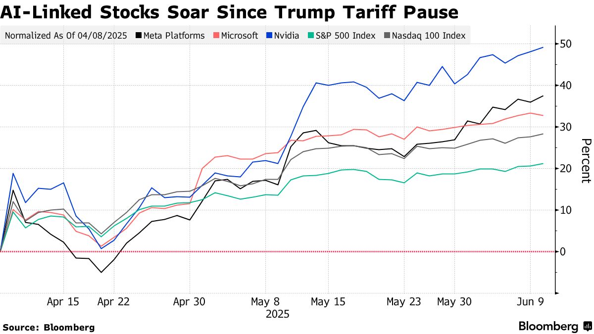 自4月9日特朗普總統暫停全球關税並將股市低迷轉為繁榮以來,最大的人工智能交易所交易基金——Global X人工智能與技術ETF上漲34%,而AI芯片製造商英偉達公司飆升49%。Meta上漲38%,微軟攀升33%——均超過標普500指數21%的漲幅和科技股為主的納斯達克100指數28%的反彈。