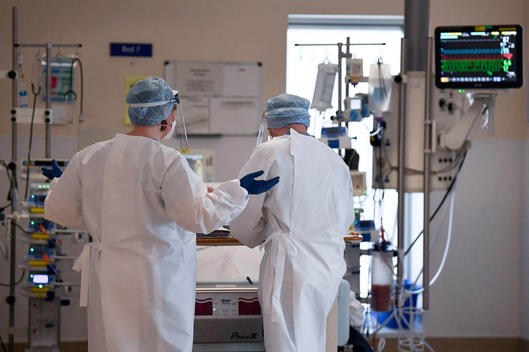 2021年,蘇格蘭艾爾德里,蒙克蘭茲大學醫院醫護人員在ICU病房照料新冠陽性患者。