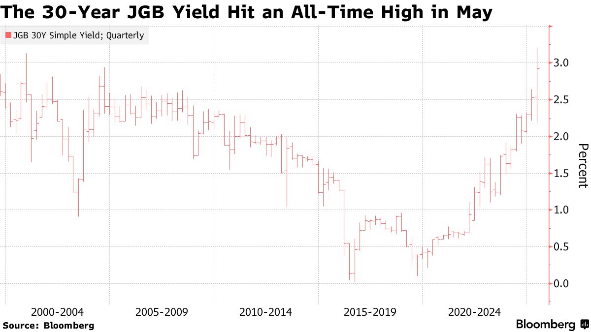 30年期收益率上月首次突破3.2%,這波拋售潮源於市場擔憂壽險公司和養老基金等傳統投資者需求減弱。儘管日債利率仍遠低於同期美債,但日本長短端利差已高於美國等其他發達債券市場。