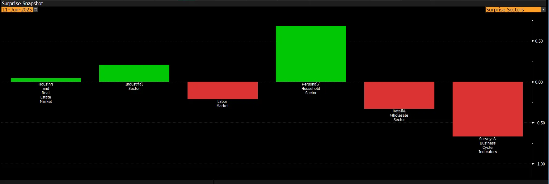這基本上就是我們目前看到的情況。通脹正在降温,勞動力市場同樣如此。如果你查看經濟意外指數監測(終端代碼ECSU),會發現不僅調查數據低於預期,勞動力市場和零售/批發領域的數據也比經濟學家預測的疲軟。關鍵問題已非通脹,而是經濟疲軟。